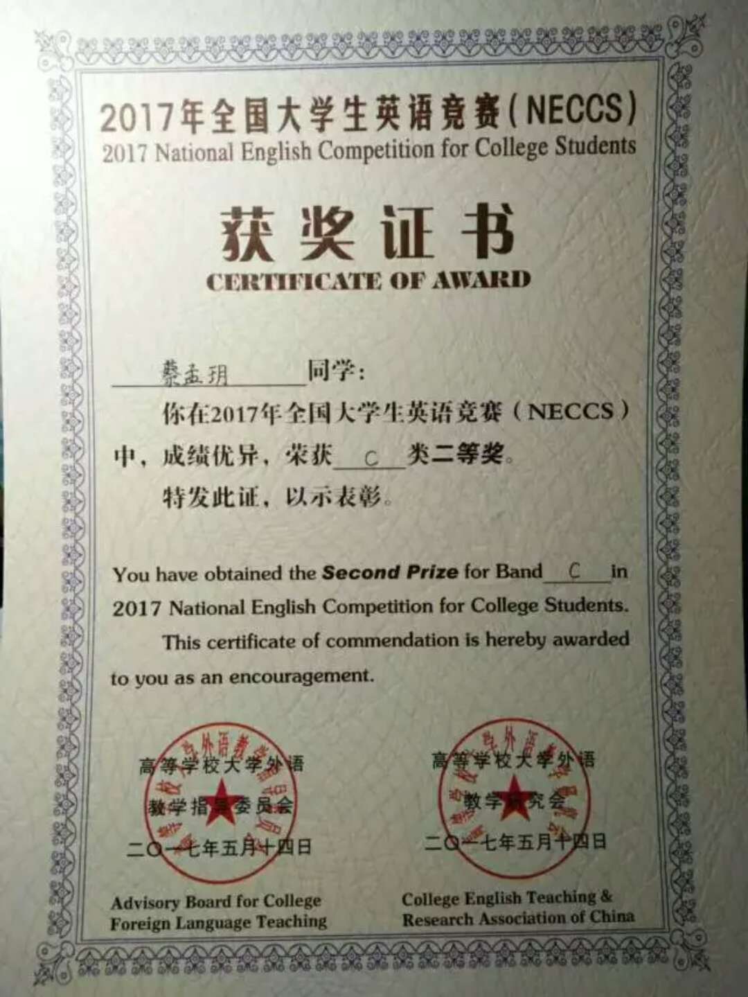 大一学年她还获得全国大学生英语竞赛、英语文化节阅读比赛和写作比赛二等奖.