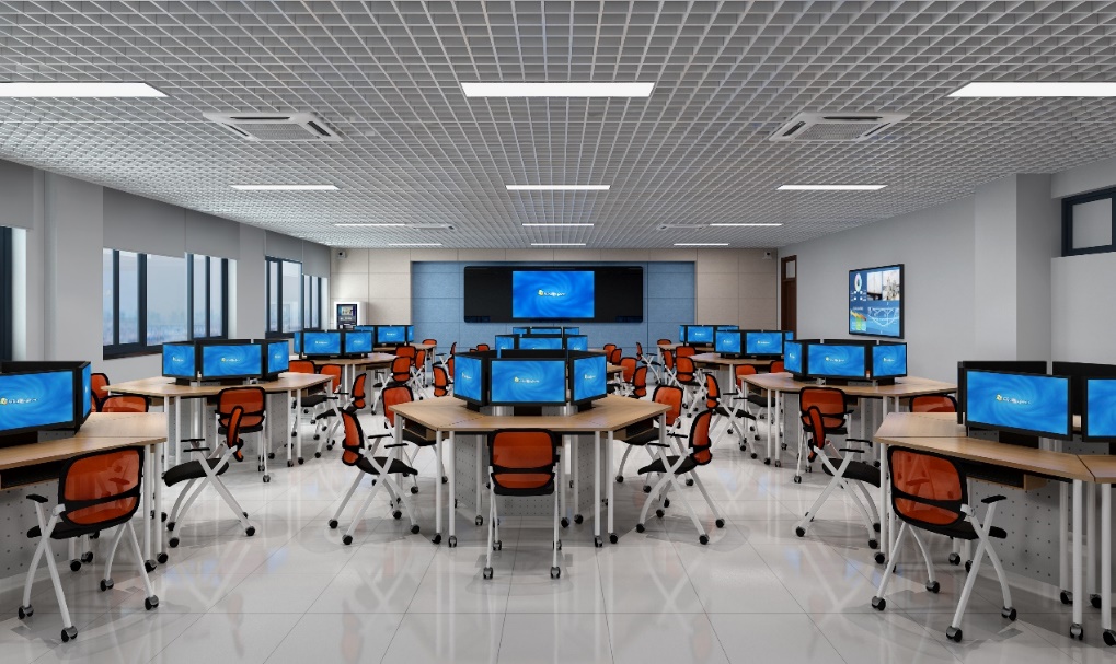 实验室配置的智慧教学系统由智慧黑板、功放、音箱、无线麦克及配套控制系统构成。可在智慧黑板上展示各种多媒体信息,支持多点触控及手势操作,手机画面可实时共享到黑板上,实现师生交互式课堂教学。云桌面系统实现了大规模分散、异构终端的统一管理和维护,可远程快速部署多种教学实验环境,满足个性化上课需求。实验室配置有六边形定制电脑桌,方便学生分组讨论。