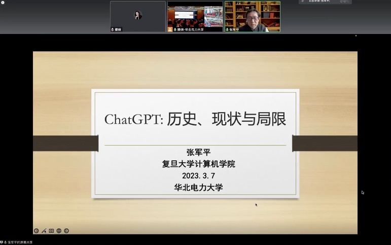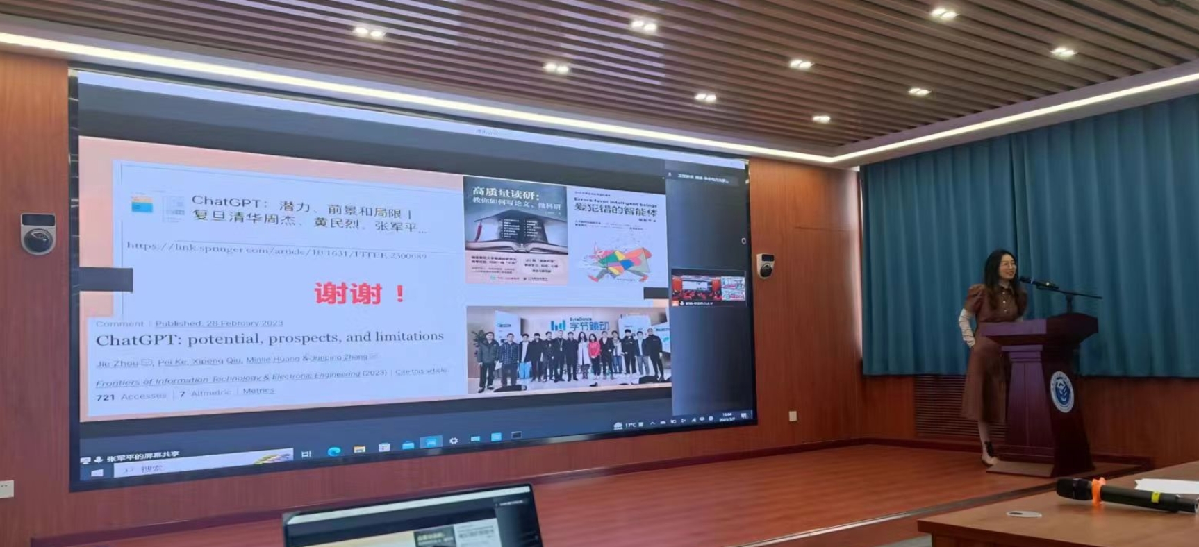 张军平教授以《ChatGPT:历史、现状与局限》为题为全院师生作学术报告。本次报告由人工智能与物联网工程教研室主任滕婧主持。